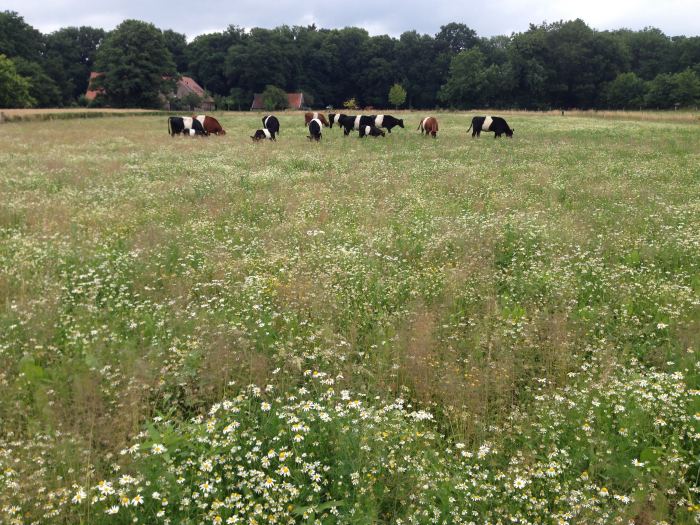 Gezond voer. Deze weides zijn niet alleen een lust voor het oog, ze zijn bovenal rijk aan vitamines, mineralen en hebben een hoog eiwitgehalte. Hierdoor hoeven de koeien niet bijgevoerd te worden met supplementen, krachtvoer en soja. In feite produceert de boer zijn eigen gezonde voer! Een mooi bijkomend gegeven is dat de vele verschillende plantensoorten insecten en bijen aantrekken. Ook weidevogels zijn blij met deze stukjes grond.